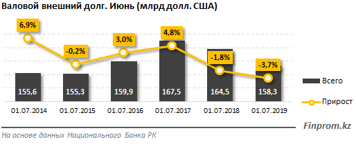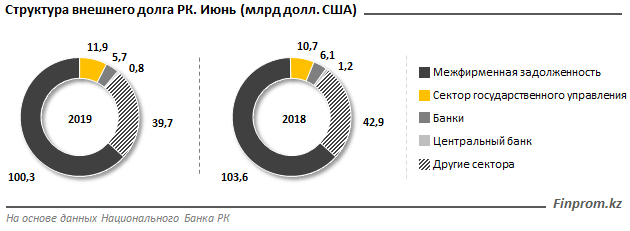По состоянию на 1 июля в структуре внешнего долга Казахстана преобладает межфирменная задолженность: 100,3 миллиарда долларов США, или 63,3 процента от общей суммы. Это на 3,3 процента меньше, чем год назад. Государственный внешний долг Казахстана составил 12,6 миллиарда долларов США, это 8 процентов от общей суммы. Год назад он равнялся 11,9 миллиарда долларов. Внешний долг банков снизился за последний год на 6,5 процента и составил 5,7 миллиарда долларов.