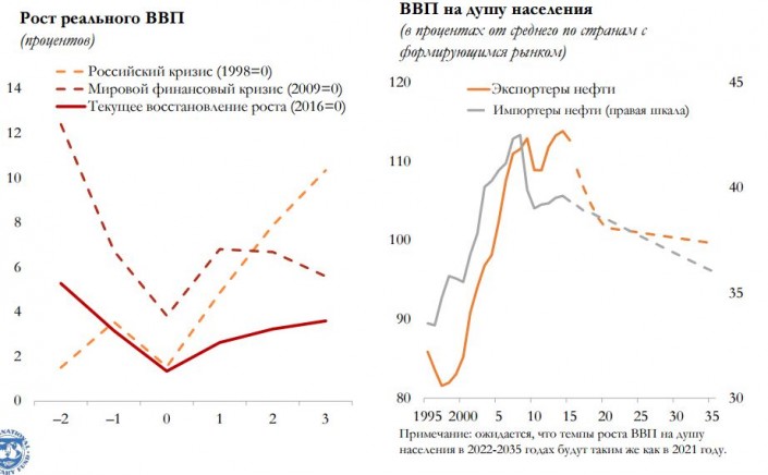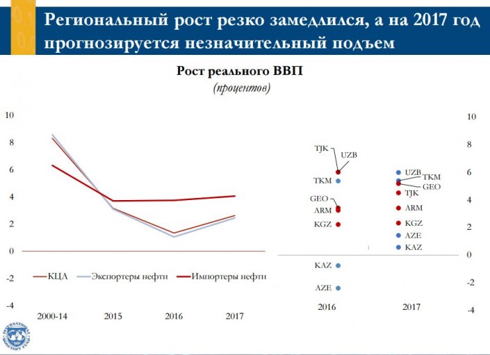 "В ближайшие годы уровень цен на биржевые товары и темпы роста в странах, являющихся основными торговыми партнерами, будут оставаться низкими. Прогнозируется медленный и непрочный подъем экономики в условиях вялой внешнеэкономической конъюнктуры, обострения факторов уязвимости и снижения пространства для маневра в сфере экономической политики", - сказал заместитель директора департамента стран Ближнего Востока и Центральной Азии МВФ Юха Кяхконен.