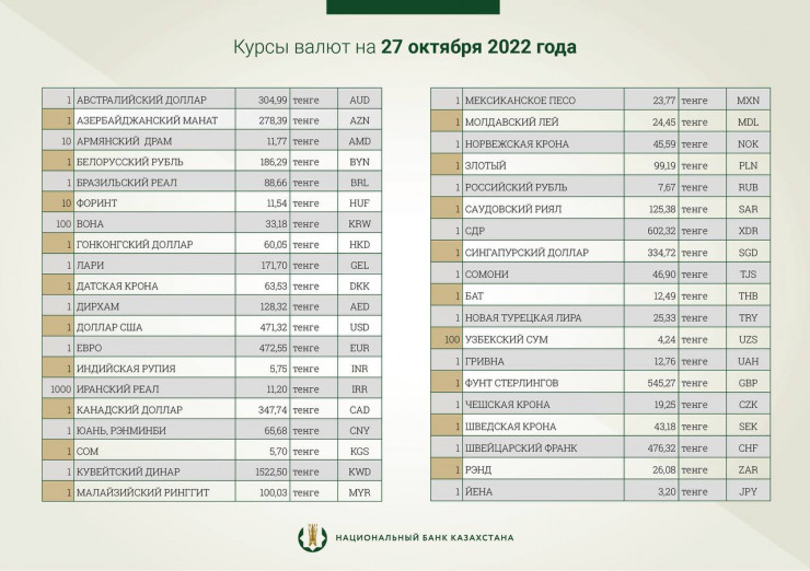 Национальный банк Казахстана установил официальные курсы доллара и рубля к тенге на 27 октября, передает корреспондент Tengrinews.kz.
