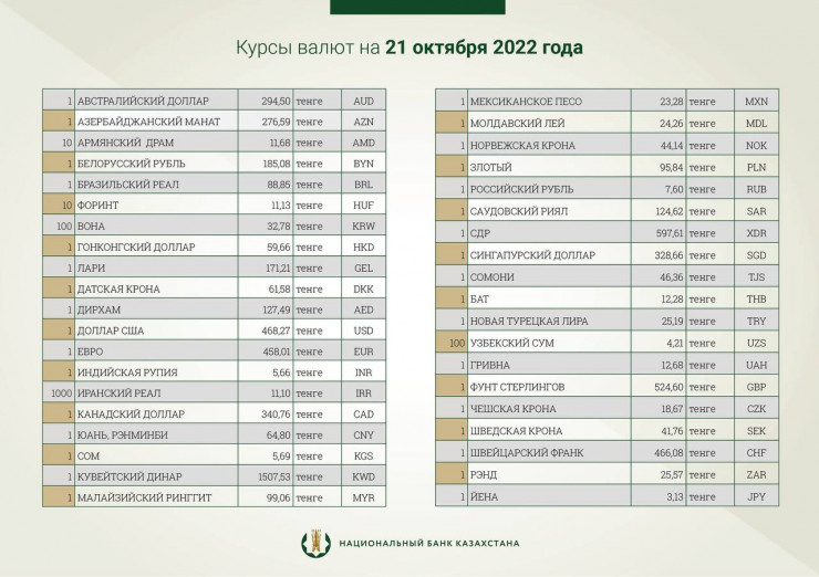 Национальный банк Казахстана установил официальные курсы доллара и рубля к тенге на 21 октября, передает корреспондент Tengrinews.kz.
