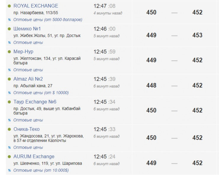 Отметим, что некоторые обменники в Алматы продают валюту по курсу 455 тенге за доллар.