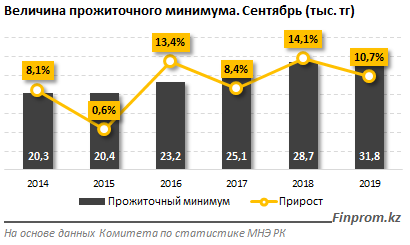 В сентябре текущего года величина прожиточного минимума составила 31,8 тысячи тенге - на 10,7 процента больше, чем за аналогичный период прошлого года (28,7 тысячи тенге). При этом по сравнению с прошлым месяцем прожиточный минимум снизился на 0,7 процента.