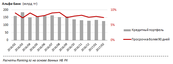 Второй крупнейший российский банк, представленный в РК, - Альфа-Банк. Ссудный портфель банка за год, к концу февраля 2017 года, сократился на 33,2 миллиарда тенге (20,9 процента), до 125,7 миллиарда тенге. Доля просрочки более 90 дней у Альфа-Банка уменьшилась с 8,9 процента до 7,4 процента, что является близким к уровню просрочки всех БВУ РК - 7,3 процента.