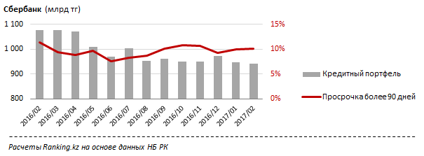 Сбербанк - самый крупный из российских банков на рынке РК, по объему ссудного портфеля банк занимает 4-е место. К концу февраля 2017 года объем кредитов Сбербанка составил 940,3 миллиарда тенге, потеряв за год 135,7 миллиарда (12,6 процента). Выбыв из списка триллионеров в конце мая 2016 года, в конце июля он вернулся в список вновь, но уже в следующем месяце окончательно выбыл из него. Уровень просрочки свыше 90 дней уменьшился с 11,3 процента до 10,1 процента, что выше рекомендуемой доли НБ РК.