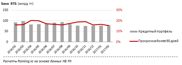 Ссудный портфель Банка ВТБ за год, к концу февраля, потерял 13,4 миллиарда тенге (14,6 процента) и составил 78,4 миллиарда. Доля просроченных кредитов свыше 90 дней составляет 15,5 процента, за последний год этот показатель достигал 20,2 процента.