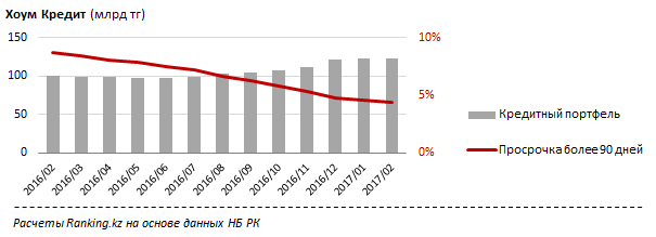 Хоум Кредит Банк за период февраль 2016-2017 показал прирост-на 21,3 миллиарда тенге (21,1 процента) и составляет 122,1 миллиарда. Доля просроченных кредитов свыше 90 дней сократилась  с 8,7 процента до 4,4.