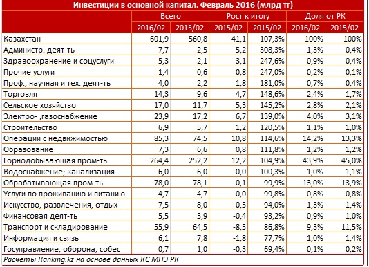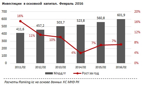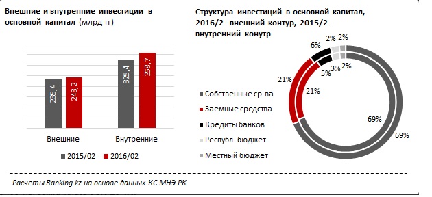 По информации аналитиков, иностранные инвестиции в тенговом эквиваленте за первые два месяца 2016 года составили 243,2 миллиарда тенге. В то же время внутренние инвестиции показали более высокие темпы роста: на 10,2 процента, до 358,7 миллиарда тенге.
