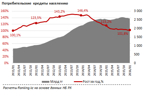 В Казахстане на начало 2016 года почти остановился рост объема потребительского кредитования. Если в январе 2015 года он составлял 15,2 процента, то к январю 2016-го планомерно сократился до 1,8 процента - до пятилетнего минимума. Об этом сообщает аналитическая служба Ranking.kz.
