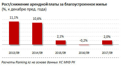 Снижение стоимости аренды благоустроенного жилья за девятимесячный период прошедшего года было зафиксировано только в Алматы, сообщает Ranking.kz. Цены в городе в сентябре 2017 года упали по сравнению с декабрем 2016-го на 3,4 процента. В свою очередь, в прошлом году за аналогичный период времени плата за жилье упала в пяти регионах.