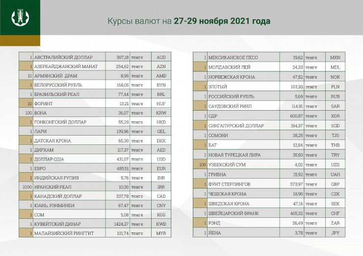 В выходные дни и понедельник курс доллара будет равен 431,07 тенге. Отметим, что официальный курс американской валюты на 26 ноября составляет 429,84 тенге.