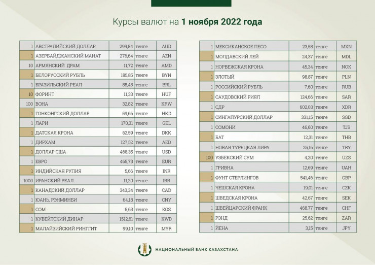 Национальный банк Казахстана установил официальные курсы доллара и рубля к тенге на 1 ноября, передает корреспондент Tengrinews.kz.