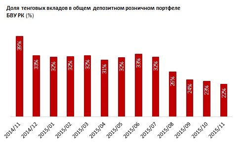 "В 2014 году динамика изменения объема тенговых вкладов физлиц была более нервной, сказывалось избыточное давление девальвационных ожиданий. В результате за 11 месяцев 2014 года депозитный розничный портфель потерял 20,3 процента в размерах. При этом уровень долларизации розничного рынка вкладов в РК продолжает расти. Если годом ранее в структуре депозитов населения доля вкладов, номинированных в нацвалюте, составляла 39 процентов, то к началу декабря 2015 года доля таких вкладов снизилась на 17 процентов - до 22 процентов", - сообщает издание.