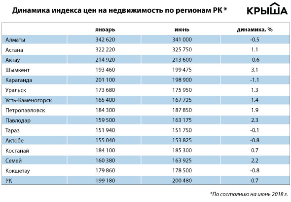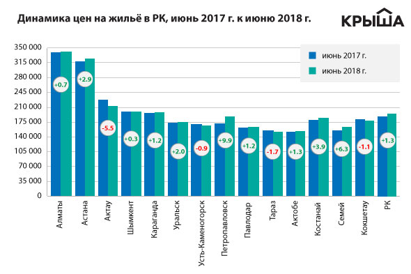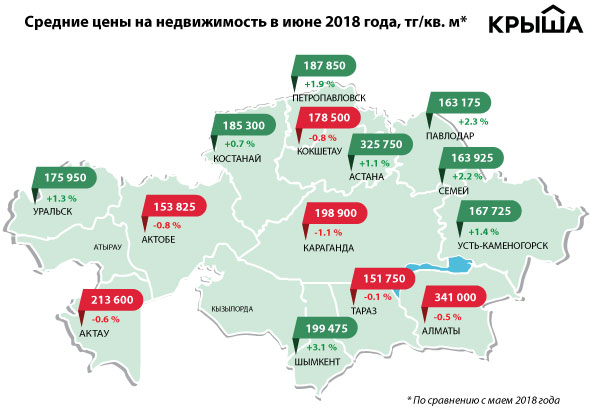 Положительная динамика в пределах 1–4 процента наблюдается (относительно июня 2017 года) в Караганде (+1,2 процента), Павлодаре (+1,2 процента), Актобе (+1,3 процента), Уральске (+2 процента ), Астане (+2,9 процента) и Костанае (+3,9 процента). В Алматы и Шымкенте зафиксирован прирост, но менее значительный: 0,7 и 0,3 процента соответственно.