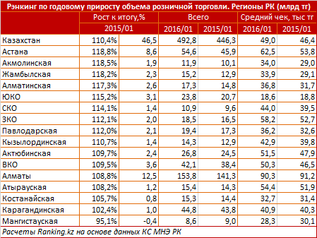 Примечательно, что розничный оборот сократился только в Мангистауской области на 4,9 процента. Вместе с тем, сумма среднего чека в Мангистауской области уменьшилась на шесть процентов, в Алматы - на 1,1 процента и  в ЮКО - на 0,7 процента, причем там тенденция обусловлена ростом городского населения.