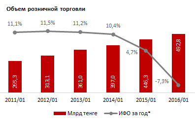 По данным экспертов, рост цен поддержал денежные объемы розничной торговли. Так, в январе 2016 сумма продаж в рознице составила 492,8 миллиарда тенге. Это на 10 процентов больше, чем за аналогичный период прошлого года. Отмечается, что за последний год это самый высокий уровень роста.