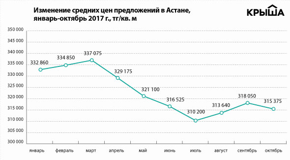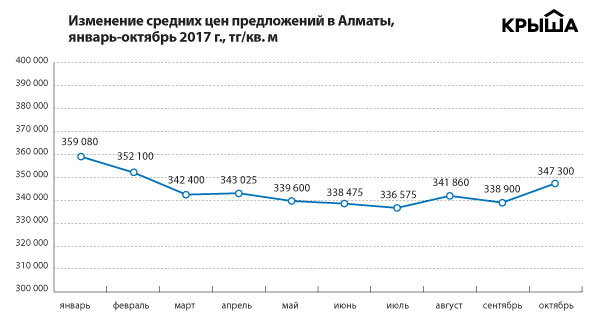 К примеру, сопоставив октябрьские показатели за 2015, 2016 и 2017 годы в Астане и Алматы, можно заметить, что за три года цены снизились на 20 и 15 процентов соответственно. При этом за последние 12 месяцев цены скорректировались в среднем только на 5 процентов.