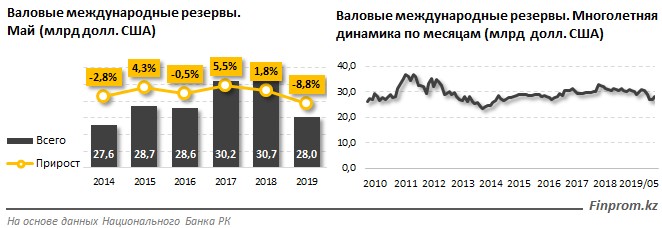 На конец мая текущего года валовые международные резервы сократились на 8,8 процента за год и составили 28 миллиардов долларов. В аналогичном периоде прошлого года их сумма достигала 30,7 миллиарда долларов, увеличившись в годовой динамике на 1,8 процента.