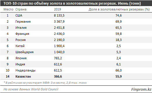 За первый квартал 2019 года Казахстан закупил 11,2 тонны ценного металла. В рейтинге стран по объемам золота в золотовалютных резервах Казахстан занял 14-е место.