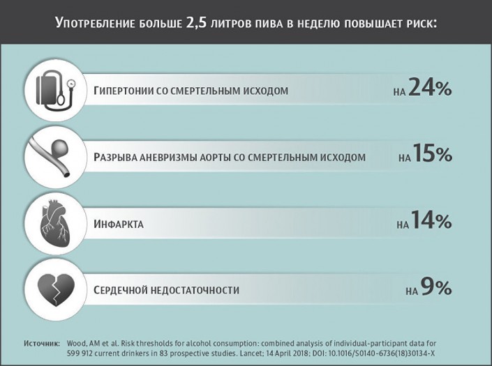 По мнению авторов работы, риск преждевременной смерти и негативное воздействие на организм резко возрастают после того, как человек начинает употреблять больше 2,5 литра пива крепостью четыре процента в неделю. Такие люди чаще страдают от инфарктов, гипертонии со смертельным исходом, сердечной недостаточности и разрыва аневризмы аорты.