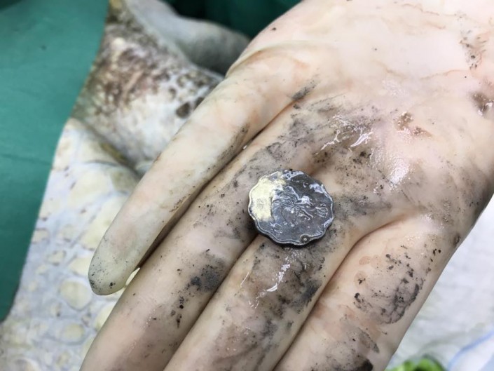 Как показало 3D-сканирование, в желудке 60-килограммовой рептилии, имя которой означает "банк" или "копилка", находилось огромное металлическое образование. Разрезав брюхо черепахи, медики извлекли оттуда 915 монет весом почти в 5 килограммов и два рыболовных крючка. Процедура заняла около 7 часов.