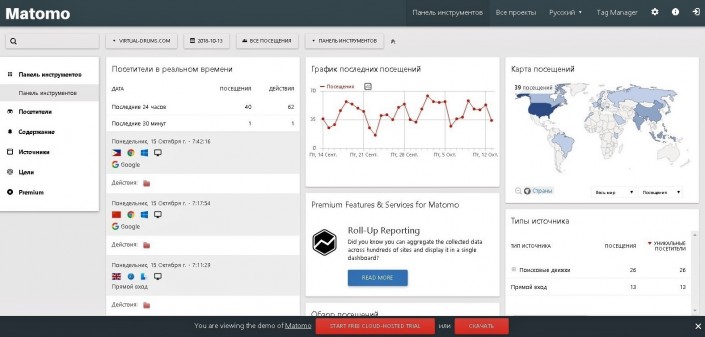 Отметим сразу, что Matomo - бесплатный сервис с открытым исходным кодом. Называвшийся до недавнего времени Piwik, он был создан в 2007 году в Лондоне. С его помощью можно отслеживать трафик веб-сайтов, конверсию, загрузки и многое другое, анализировать показатели в электронной коммерции, изучать статистику интранета.