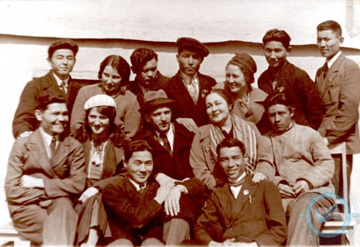 Курсы по повышению квалификации режиссеров. 1-й ряд слева направо: Б.Г. Ильинский (первый), Ю.Л. Рутковский (третий), С.А. Ахметов - начальник Управления по делам искусств при Совете министров Казахской ССР (четвертый), А.А. Алексеев (шестой). 1947 г. ЦГА РК. Ф. 1712. Оп. 1. Д. 20.