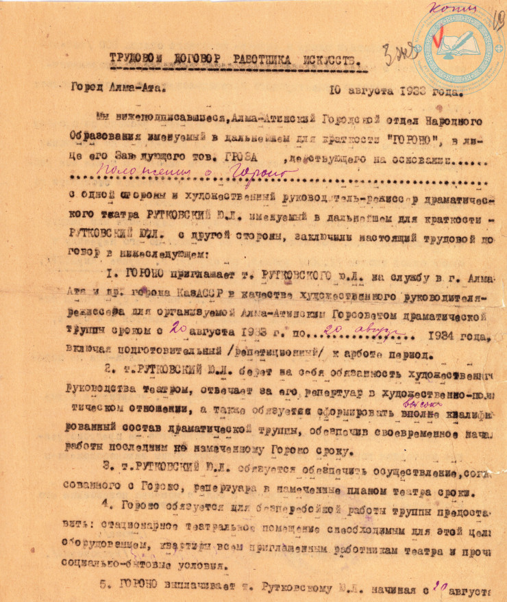 Трудовой договор Ю.Л. Рутковского с Алма-Атинским городским отделом народного образования о приеме на работу художественным руководителем-режиссером русского драматического театра. 1933 г. ЦГА РК. Ф. 1712. Оп. 1. Д. 29.