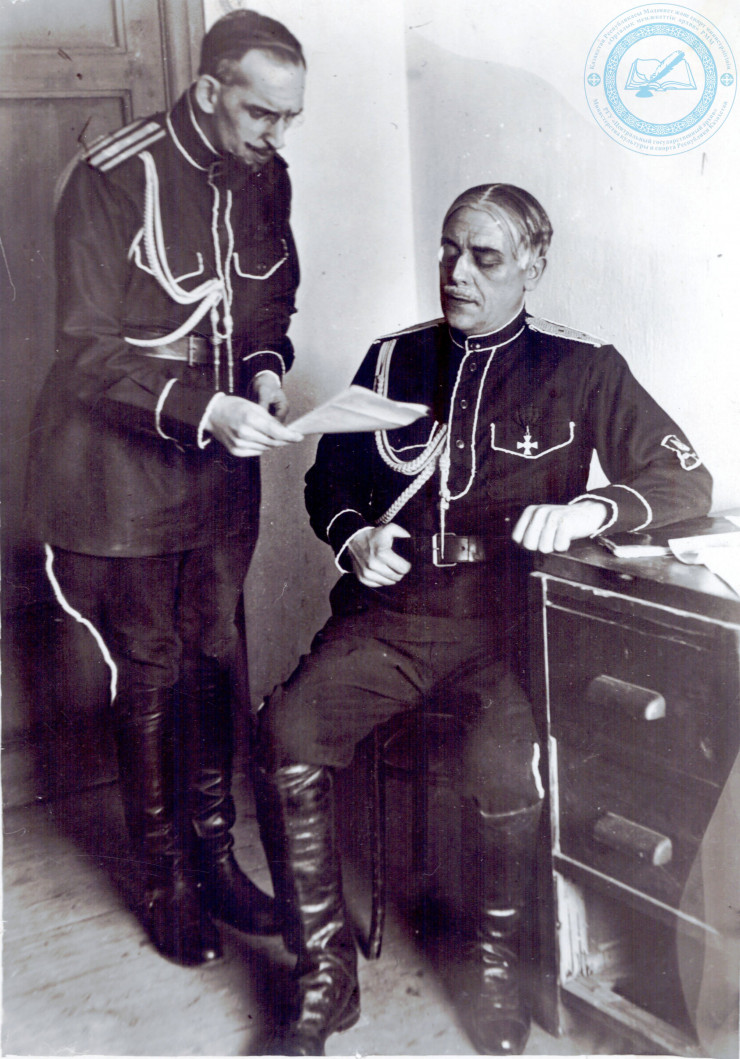 Ю.Л. Рутковский (слева) в роли начальника штаба, Странский в роли генерала Марева в спектакле "Чапаев" по роману Д.А. Фурманова. Алма-Ата. 1935 г. ЦГА РК. Ф. 1712. Оп. 1. Д. 50.