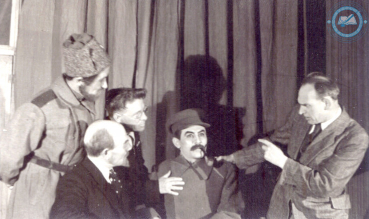 Казахский академический театр драмы. Репетиция спектакля "Человек с ружьем" по пьесе Н.Ф. Погодина в постановке Ю.Л. Рутковского и Ш.К. Айманова (слева направо): Ш.К. Айманов в роли солдата Шадрина, Умурзаков Е. в роли Ленина, Гуськов (гример), Бадыров К. в роли Сталина, Ю.Л. Рутковский. Алма-Ата. 1947 г. ЦГА РК. Ф. 1712. Оп. 1. Д. 61.