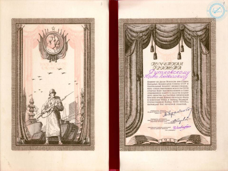 Почетная грамота Комитета по делам искусств при Совете народных комиссаров СССР Ю.Л. Рутковскому. 1945 г. ЦГА РК. Ф. 1712. Оп. 1. Д. 31.