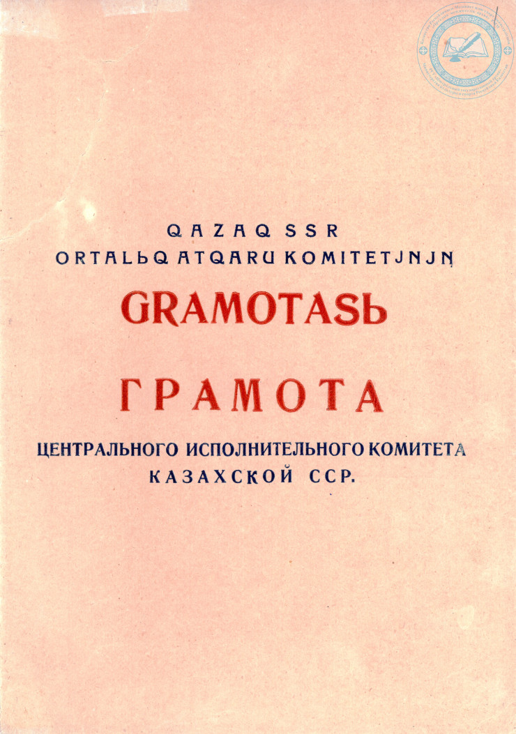Грамота Центрального исполнительного комитета Казахской ССР о присвоении Рутковскому Ю.Л. звания "Заслуженный артист Казахской ССР", 1937 г. ЦГА РК. Ф. 1712.