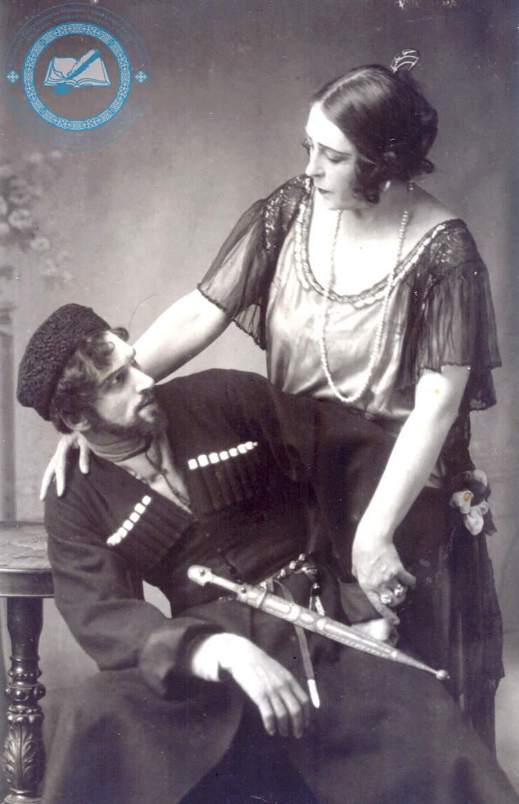 Ю.Л. Рутковский в роли Свинцова, Е.Б. Кручинина в роли Княгини в спектакле "Пять ночей". 1929 г. ЦГА РК. Ф. 1666. Оп. 1. Д. 55.
