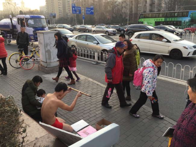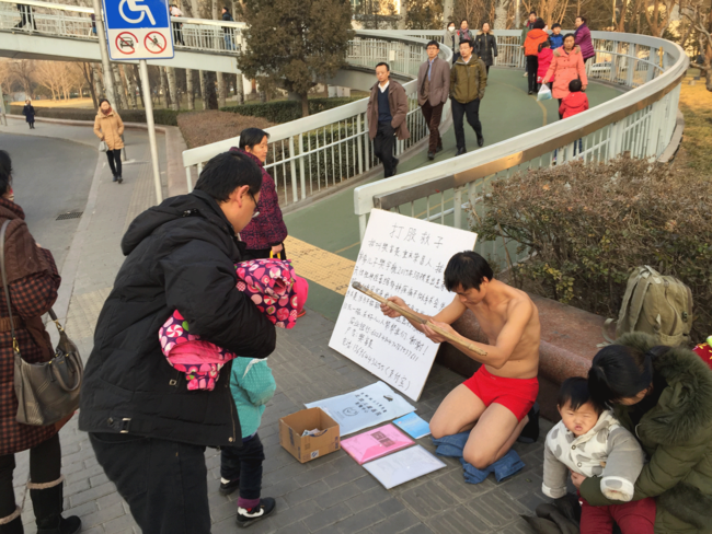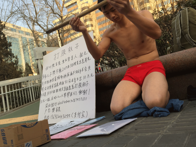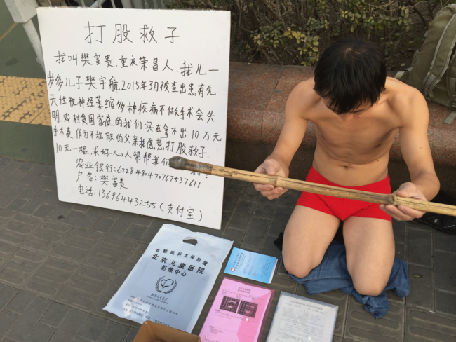 Житель Пекина Фан Фуджи встал на колени и предложил прохожим ударить его палкой всего за 10 юаней (1,5 доллара). Таким способом он хотел собрать необходимую сумму для операции его годовалого ребенка.