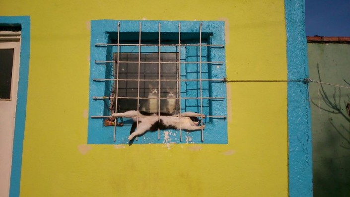 Не совсем понятно, чем занят черно-белый кот. Видимо, в такой позе очень удобно спать. Во всяком случае, вид у него довольно безмятежный. Чего не скажешь о двух его собратьях, которые смотрят в окно. На их мордочках очень серьезные выражения. Возможно автор фотографии увидел какой-то секретный ритуал из кошачьей жизни, о котором люди не должны были узнать.