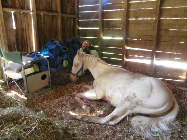 Девушка всю ночь не отходила от своей лошади, когда та плохо себя чувствовала.