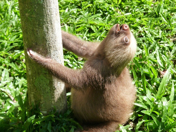 Ленивец предпочитает без дела на землю не спускаться: там много неприятных зверей, которые так и норовят его съесть. Но раз в две недели он все-таки вальяжно сползает по стволу, чтобы, чего уж там, покакать. Почему не сделать это на дереве? Биологи не понимают.