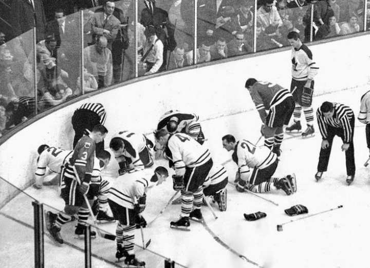 Игроки Toronto Maple Leafs и Chicago Black Hawks ищут потерянную дорогую контактную линзу Джека Эванса. Через месяц Leafs выиграют Кубок Стенли, 1962 год.
