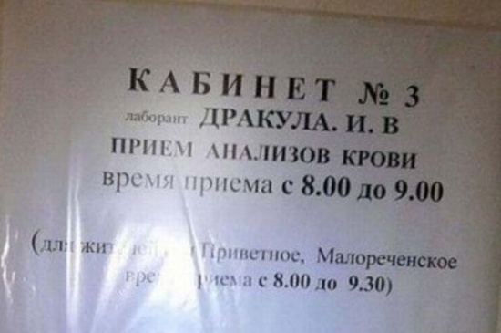 Лаборант Дракула И.В. рад принимать кровь каждое утро.