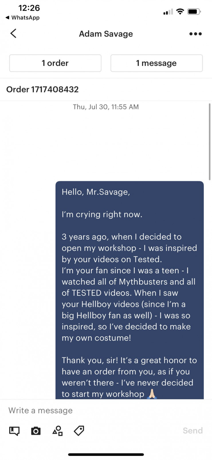 "Сначала я подумал: "Что же это за человек с таким никнеймом?" Сфотографировал, чтобы посмеяться: "Смотрите, сам Адам Сэвидж заказал у меня изделие". А когда перешел в личный кабинет на ETSY, то был в шоке. Это и вправду был Адам Сэвидж. Заказал. Попросил доставить на студию TESTED. Минут пять я сидел и удивлялся. Минут 10 рыдал. В итоге решил ему написать. Он ответил. Кумир просто заказал у своего фаната изделие. Пообщались в дайректе. Показал, над чем сейчас работает", - поделился историей собеседник.