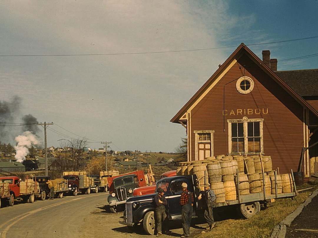 Грузовики крахмального завода в Карибу, штат Мэн, октябрь 1940 года. Фотограф Джек Делано