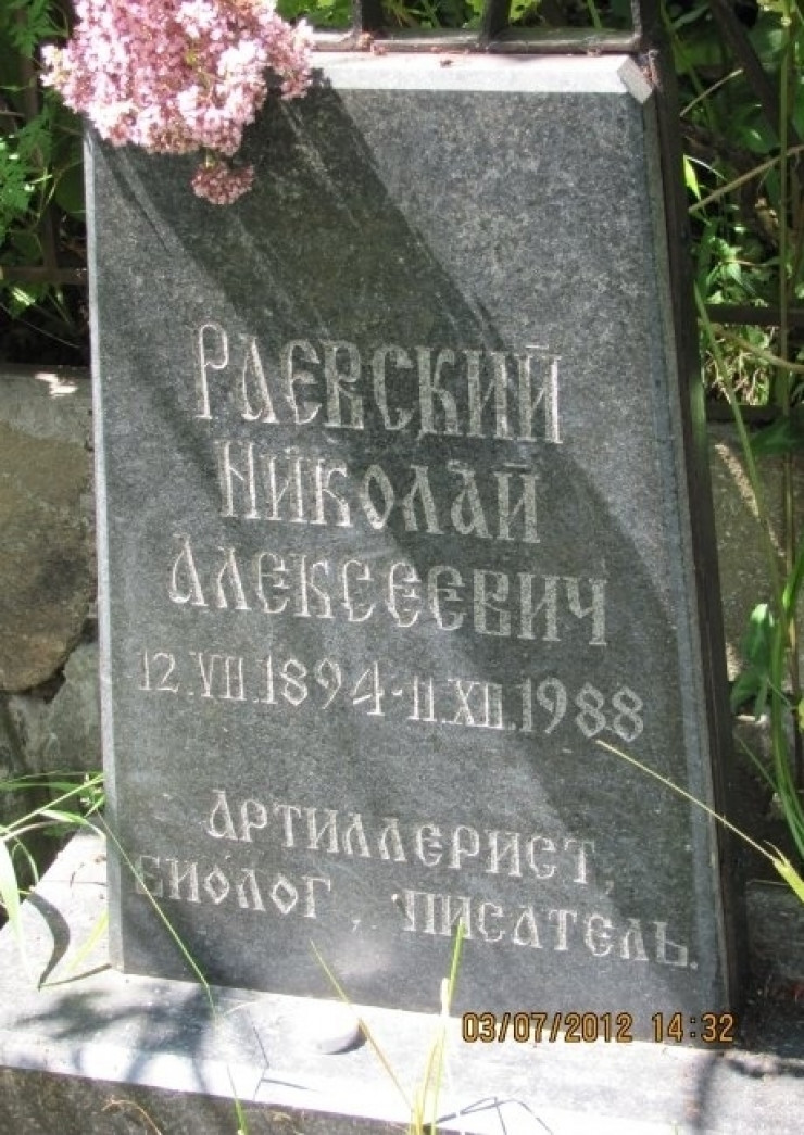 На вечере памяти кто-то cказал, что Алматы способен и порождать таланты, и притягивать их. В южной столице Раевский издал свои главные книги, сделавшие его знаменитым. И здесь же он был похоронен, в горах, которые он так любил. К месту захоронения до сих пор приходят те, кто был знаком с писателем. На его скромной надгробной плите написано "Раевский Николай Алексеевич. Артиллерист. Биолог. Писатель".