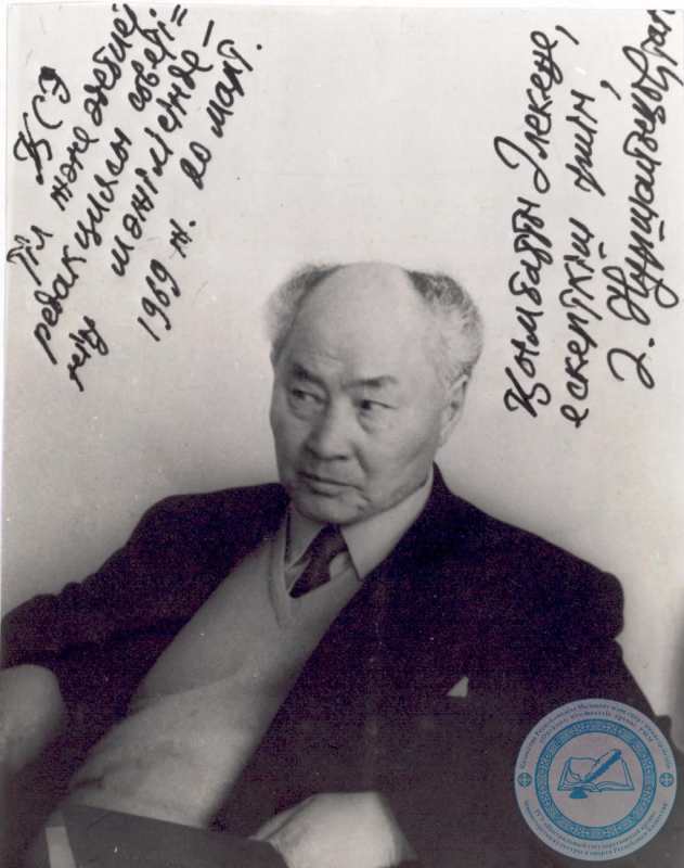 Қымбатты Әлкей Хаканович! Сізге ұзақ жылдар халық игілігіне жемісті еңбек етуіңізге тілектестік білдіреміз". М. Абаканов, Джезказганская область, Улытауский район, 28 марта 1980 г.