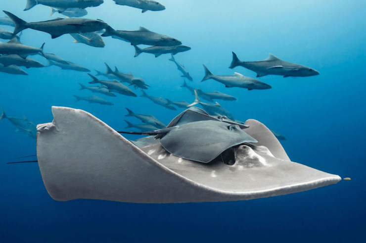 Маленькие скаты присоединились к большому. Они это делают, ища защиту от хищников и чтобы сэкономить силы на передвижение.