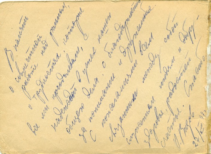 Оборот обложки рабочего сценария фильма "Кровь и пот" с автографом О. Видова. Фото из семейного архива С. К. Журабаевой и И. И. Карсакбаева