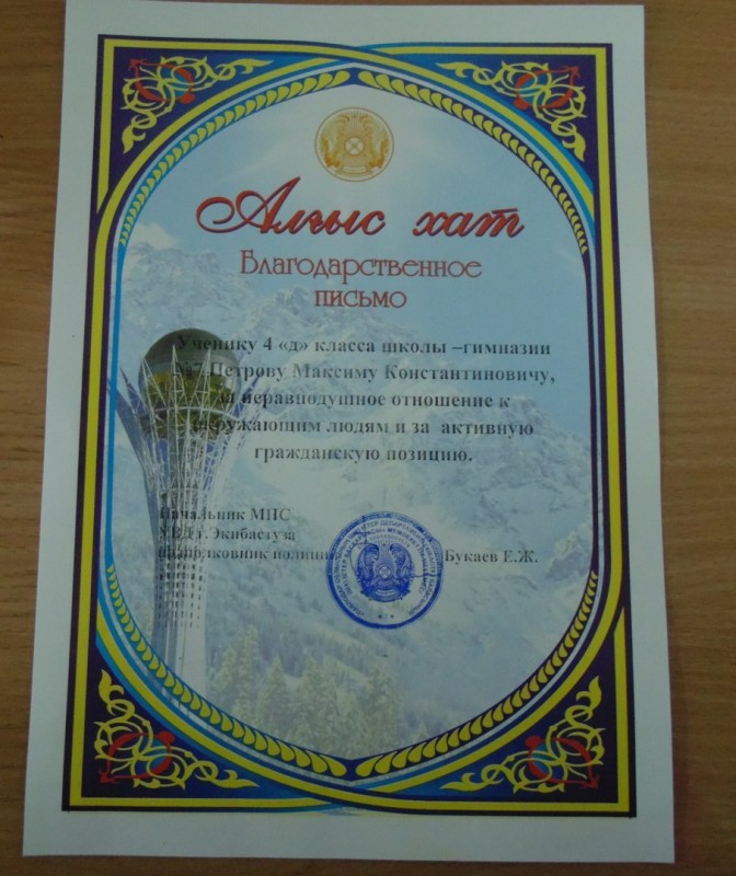 За неравнодушное отношение к окружающим и активную гражданскую позицию Максиму было вручено благодарственное письмо от имени руководства УВД Экибастуза.