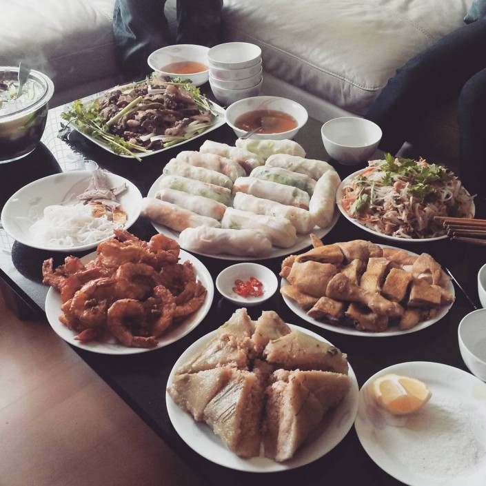 Во Вьетнаме новогодний праздник называется Тет и отмечается по лунному календарю. Он ежегодно перемещается между двадцатыми числами января и февраля. Праздничные блюда традиционно готовятся из риса и мяса. Например, свинина в кокосовом молоке или пирог бань чунг (в листья бамбука заворачивают смесь из риса и свинины и обжаривают).