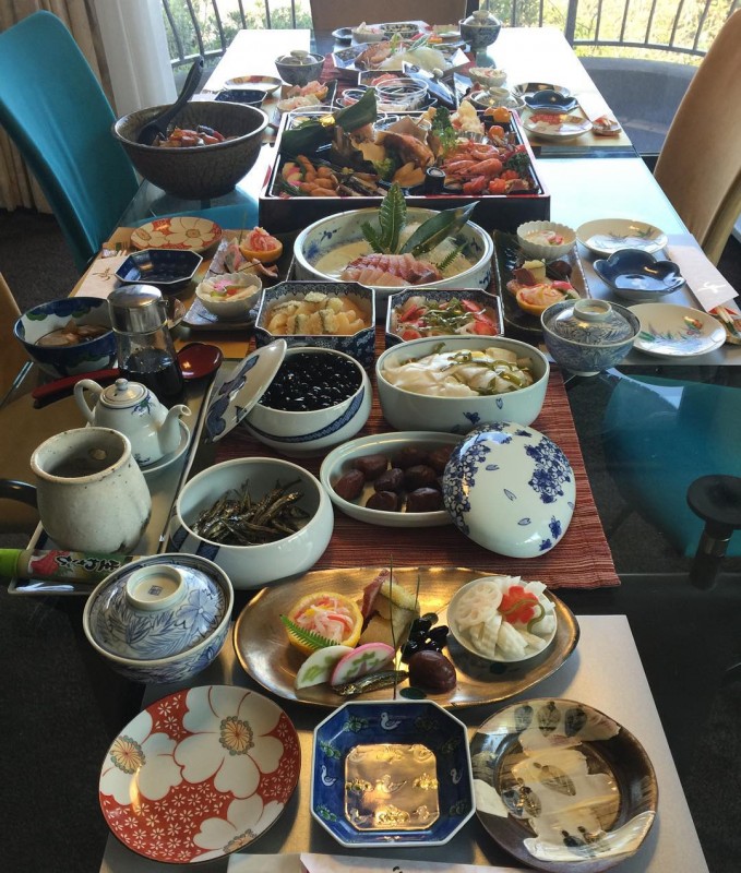 Японцы верят, что каштаны приносят успех в делах. Поэтому их добавляют в различные блюда: и в гарниры, и в десерты. Например, в пирожные моти из отварного риса. Также на новогоднем столе присутствуют морская капуста, горох, бобы и икра сельди.