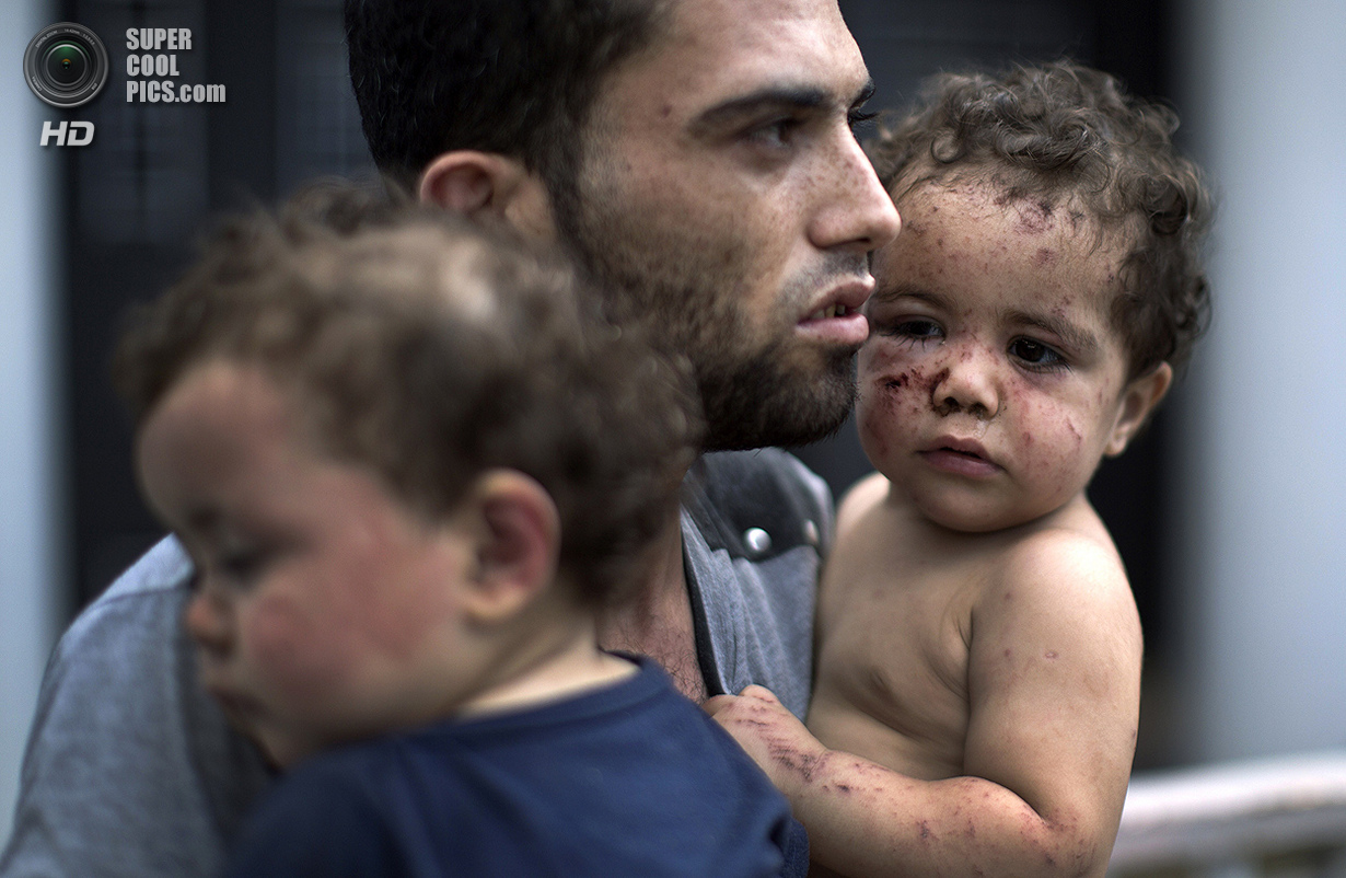 Газа. Мужчина со своими раненными дочерьми в больнице. (Mahmud Hams/AFP/Getty Images)