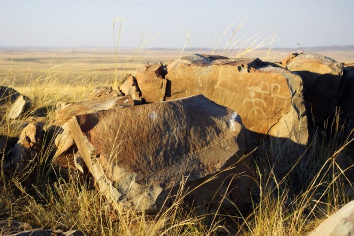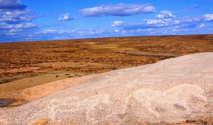Зангыртас - это пара дюжин гранитных валунов небольшого размера, выстроенных в одну линию на вершине холма, расположенного в 20 километрах к северо-востоку от поселка Улытау. Поверхность камней покрыта разнообразными рисунками, выполненными художниками бронзового века.