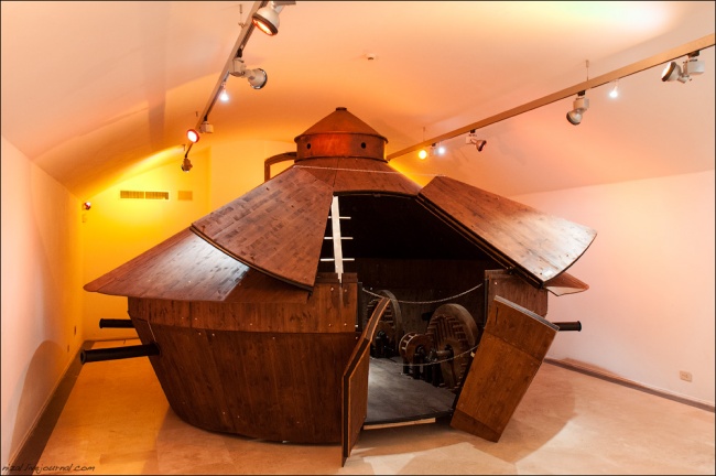 Такой вот тазик на колесах с пушками и башенкой и есть прародитель современных танков. Он был оснащен системой зубчатых колес, которые составляли последовательность. Восемь человек были защищены от сражения внешней оболочкой, поэтому могли доставить пешим ходом такого "ежа" прямо в гущу сражения, не будучи ранеными.